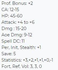 - If we want this enemy to be, for example, a fighting ogre, we can improvise the combat using the improved melee values (CA 15, Attack +6, HP 60 and dmg 20) using the rest of the values as they are, but without using the spells (since the ogre will not have access to these) or area attacks (unless we want to put a special sweeping attack).