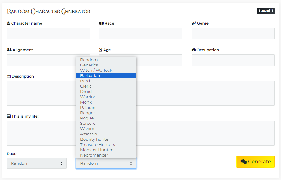 Apart from the Random Generator we have shown above, there is another tool that can be useful if you are looking to create a story for your barbarian. RoleGenerator has a character generator capable of creating your barbarian from scratch, with his history, background, family and events that have happened in his life that have led him to where he is. It is one of the most powerful tools. Click here if you want to take a look at it. Remember that you have to choose the Barbarian class before Generate.