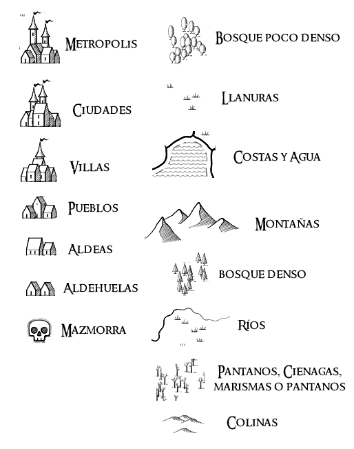 Las mazmorras están señaladas como una calavera. Estos puntos no significan que sean literalmente una estructura con celdas, prisiones y pasillos estrechos. Las mazmorras (o Dungeons) en los juegos de rol tienen un significado más amplio y significan lugares hostiles donde hay una misión y una historia interesante que contar. Desde torres de hechiceros hasta palacios de reyes oscuros, templos paganos, pirámides de dioses antiguos, cuevas heladas o guaridas de dragones. Estos puntos que tienen la calavera solo significa "Peligro" y es el Maestro de Juego el que decidirá qué tipo de aventura o amenaza es. Estos puntos pueden estar afectando a los pueblos y habitats de alrededor.